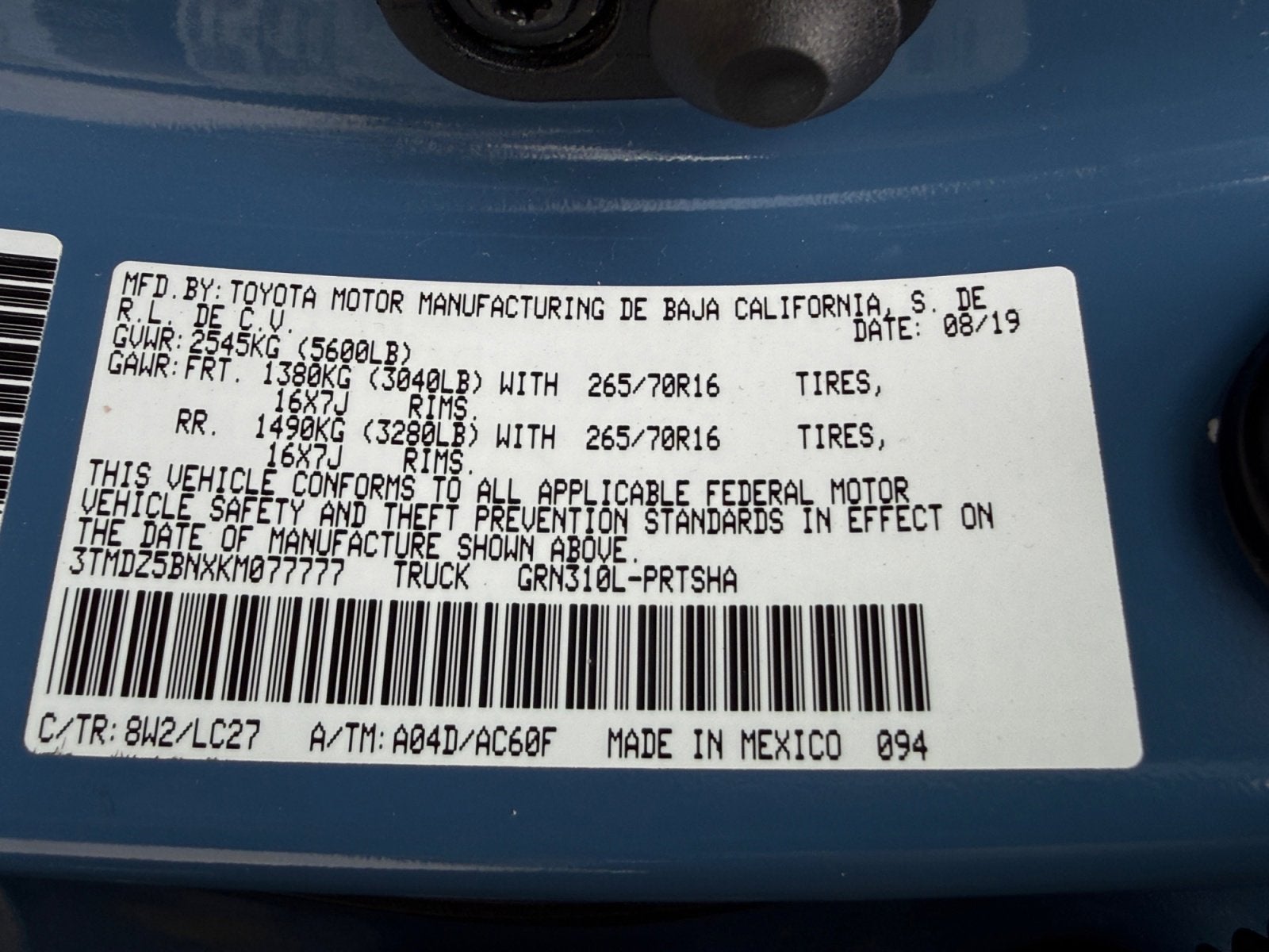 - Vehicle Name: Toyota Tacoma 4WD